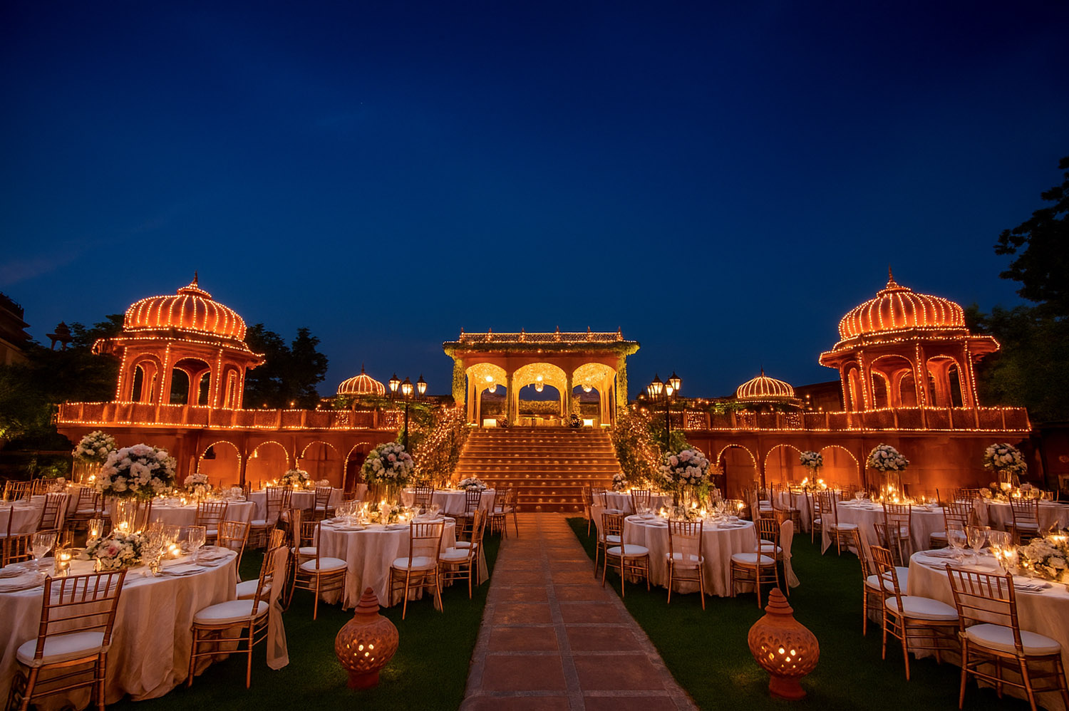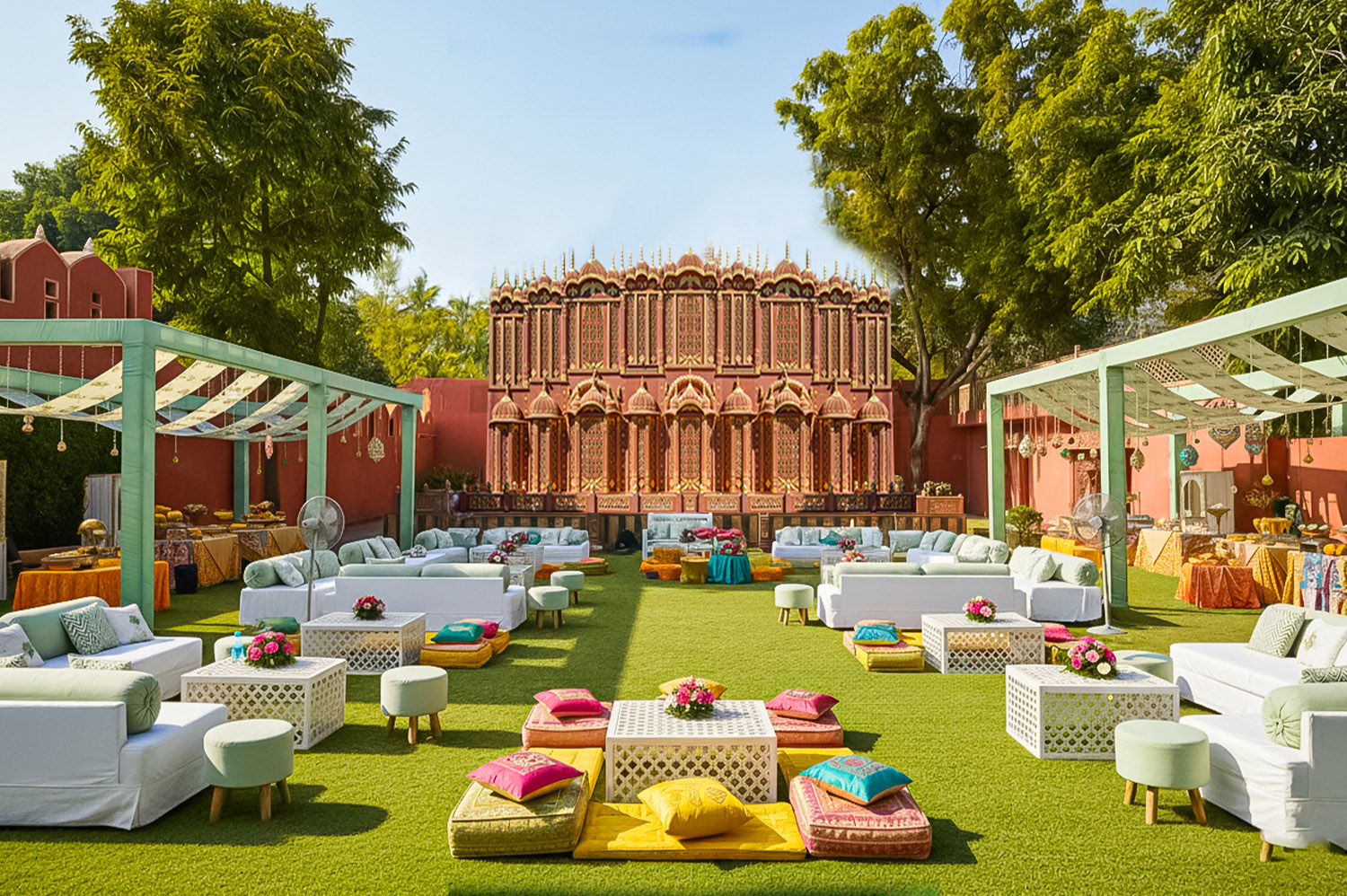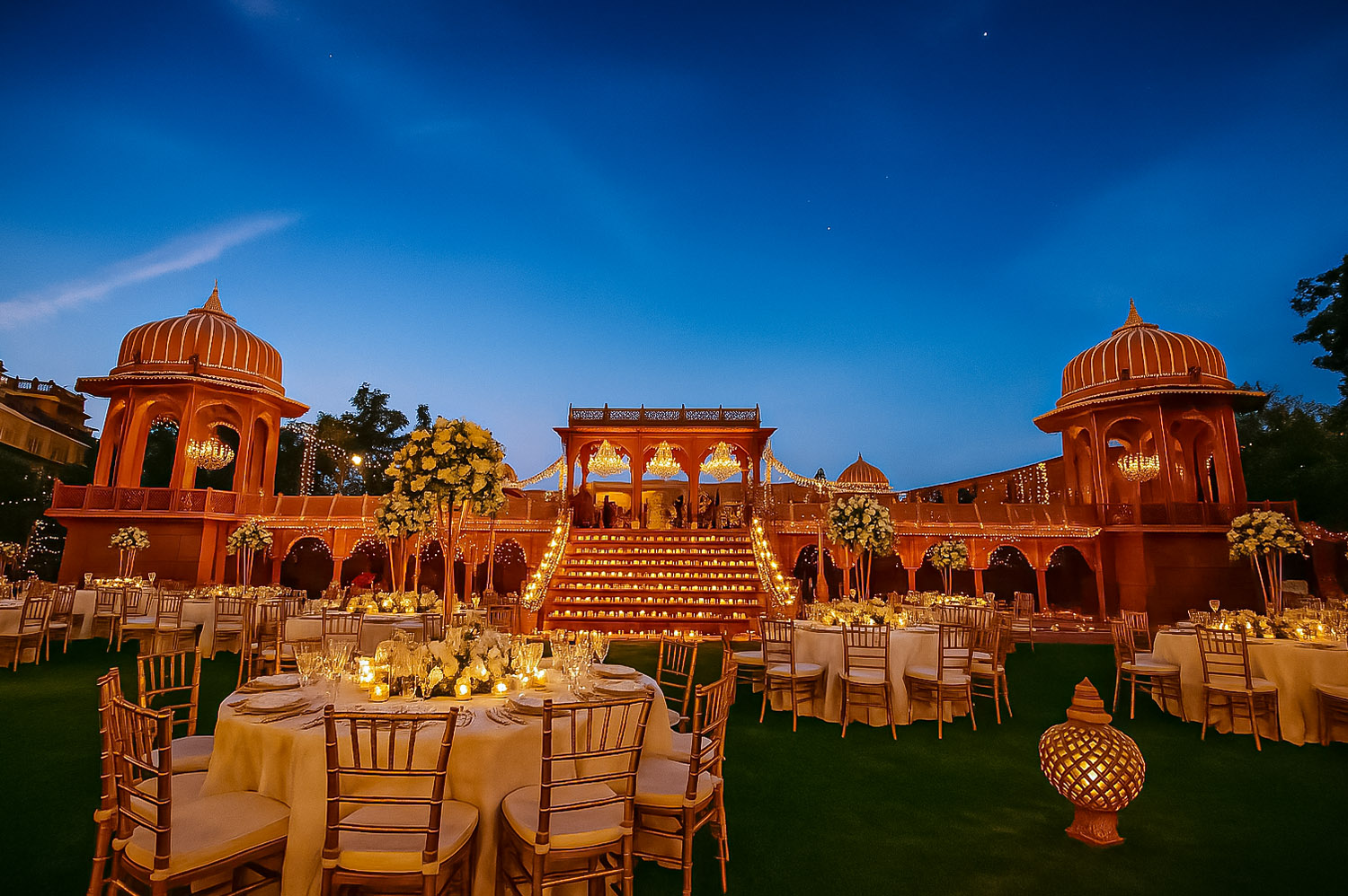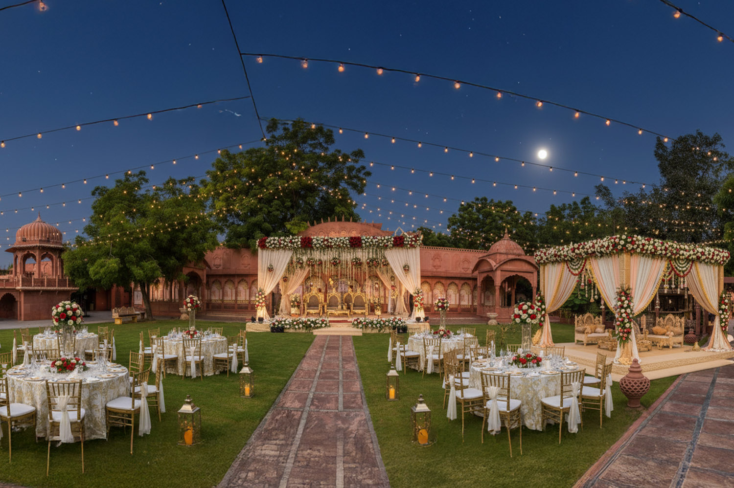 Resembling the architecture of Hawa Mahal, the “Hawa Mahal Lawn” can accommodate up to 150 guests. It is a perfect place to host small gatherings, haldi functions, and intimate weddings.