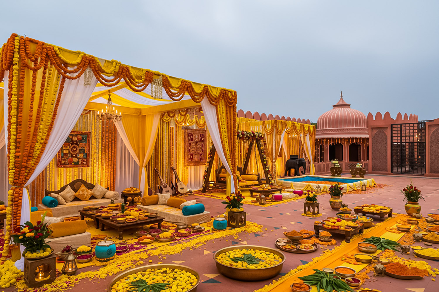 Plan your dream wedding under the stars at our open Pool Terrace Outdoor with scenic views. The Kund Terrace is an ideal place for organising Haldi and Mehandi events.